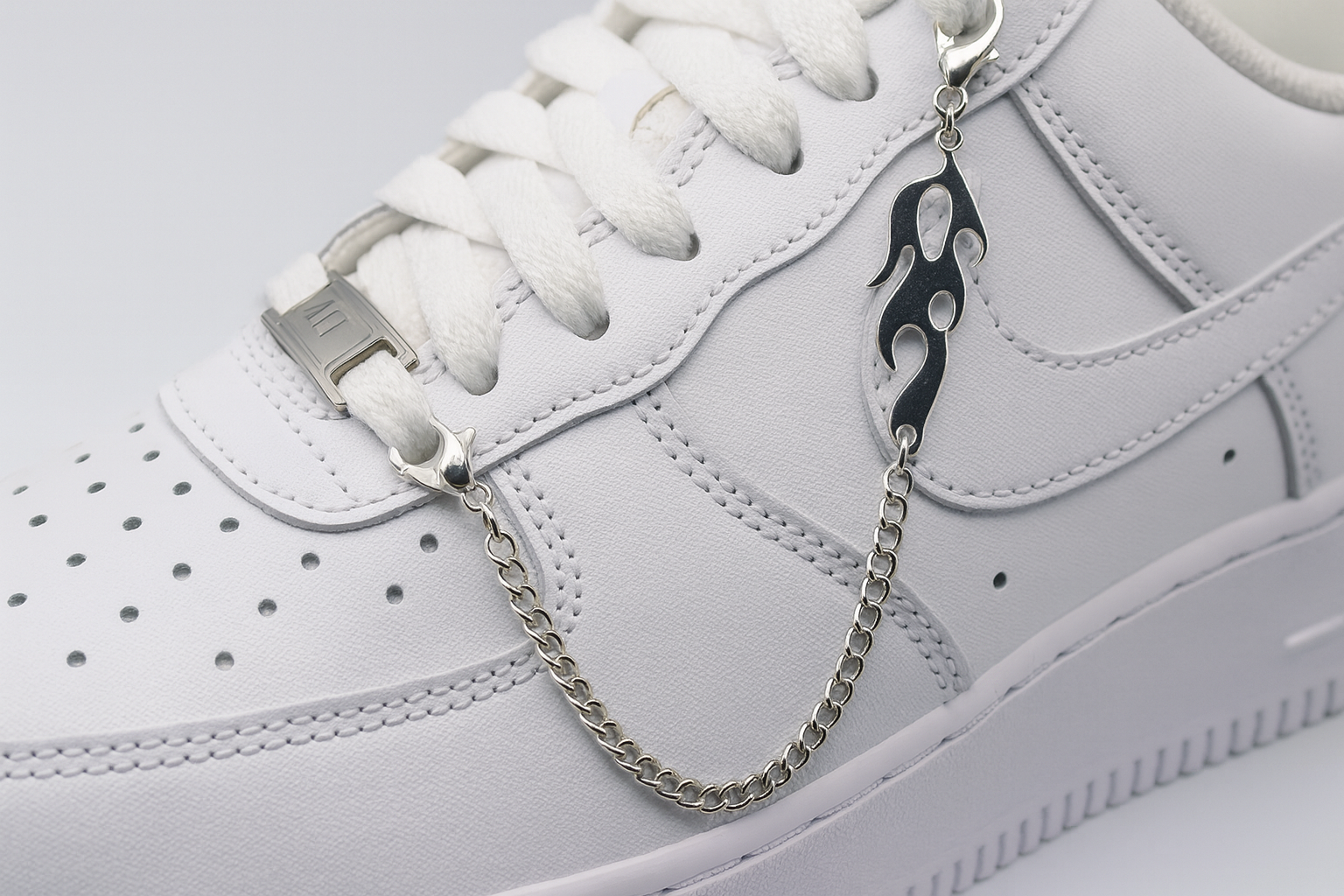 Turn up the heat on your kicks with the Blaze inferno lace chain, the ultimate sneaker accessory for streetwear lovers. Designed with a sleek siler flame pendant and premium metal chain, this lace charm adds a bold, fire-inspired touch to any pair of sneakers.